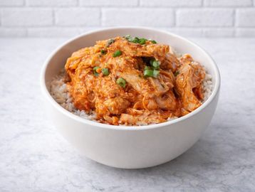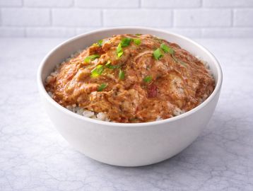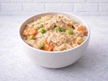 Our Crustless Chicken Pot Pie Chicken Bowls are slow simmered with peas, carrots, onions and celery, in our pot pie style gravy. Served over white rice.