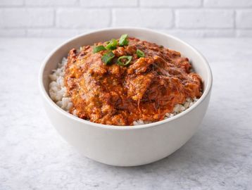 Our most popular bowl. Tender chicken slowly simmered with Italian herbs, cajun spices, garlic, diced tomato and beer. Served over steamed white rice.
